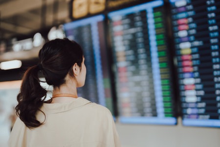 Rear view of a woman looking at arrival departure board. Generative AI illustration