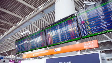 Screen with flight schedules at the Charles de Gaulle airport in Paris