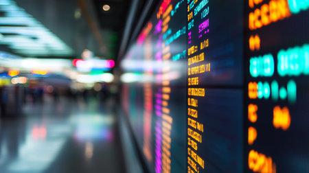 Brightly lit departure board shows flight details and statuses at an airport urban during peak travel hours, bustling with eager travelers.
