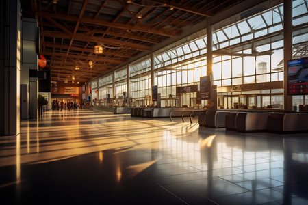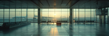 View of an empty airport terminal with sunlight pouring through large windows, an architectural shot with a view of airplanes.