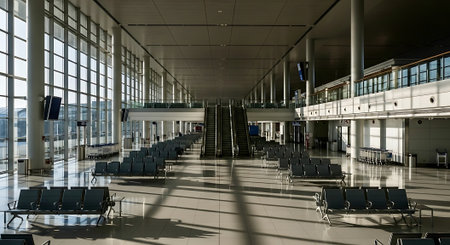Spacious airport terminal with rows of seating and large windows emphasizing travel and modern infrastructure.