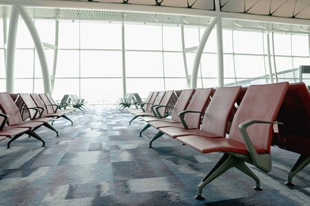Deserted airport terminal. Rows of empty seats in the waiting room.