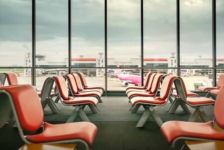 Interior of the airport terminal with rows of chairs and panoramic windows