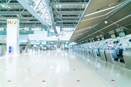 Bangkok, Thailand - June 23, 2020 : Row of empty check-in counter at Suvarnabhumi Airport during covid-19