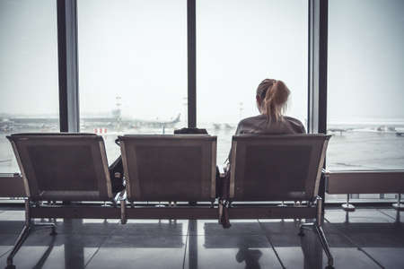 Pensive lonely woman tourist in airport terminal sitting on chair and looking on airplanes through window in departure holding zone