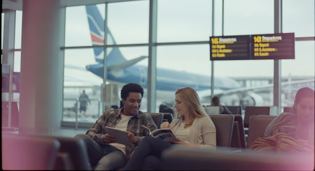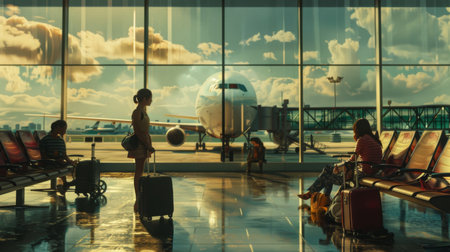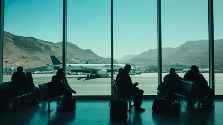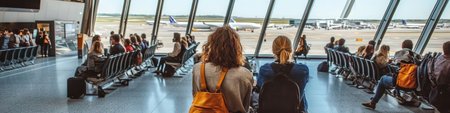 Travelers sit in the departure lounge, gazing at an airplane through the large windows of the airport terminal