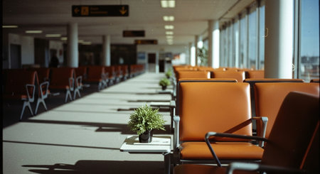 Empty airport terminal waiting area with orange seats and green plants in the foreground