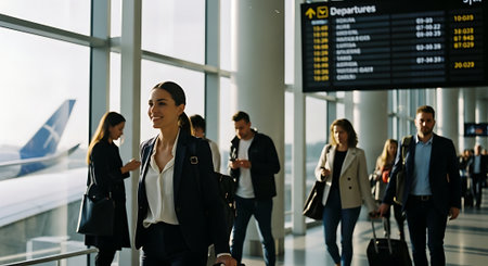 A busy airport terminal with travelers in business suits. --ar 3:2 Job ID: ce0dd29a-4b0a-4dcf-b60a-18265bb516b3