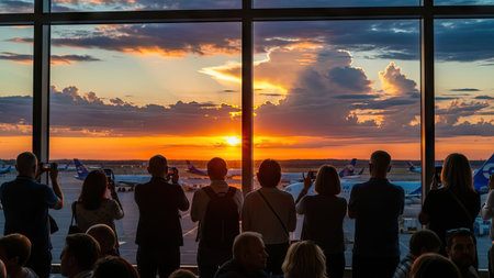 Travelers sit and stand in a lively airport terminal, silhouetted against large windows as an airplane takes off in the background at sunset.
