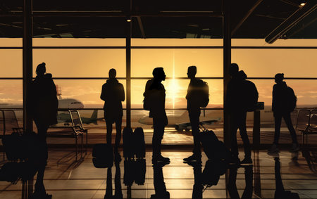 Silhouettes of business travelers walking with luggage inside an airport terminal at sunset. Airplane landing and urban skyline visible through large glass windows. Travel and business theme.