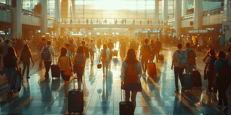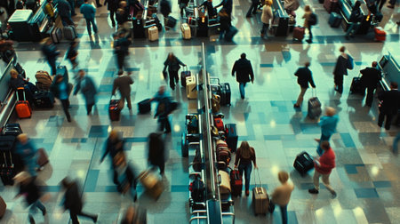busy airport with long lines of travelers and busy terminals, viewed from above, created with generative ai