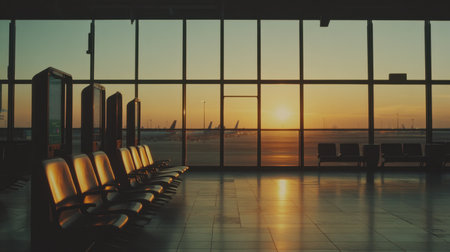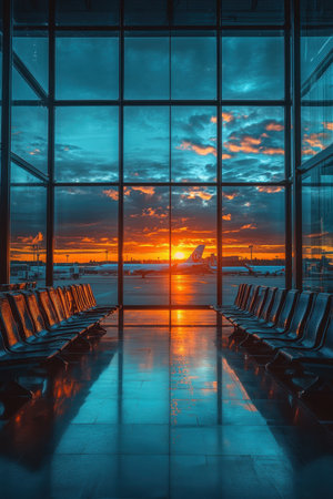 A stunning sunset fills the airport lounge with warm hues, creating a tranquil atmosphere. The large glass windows capture the orange and blue sky, reflecting upon the shiny floor as passengers wait for their flights.