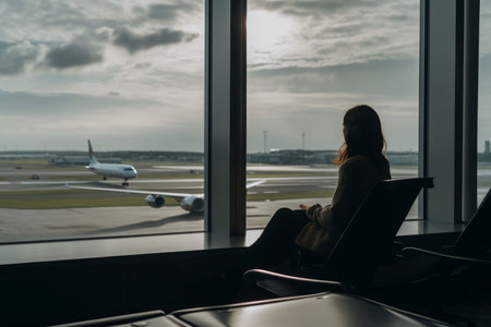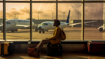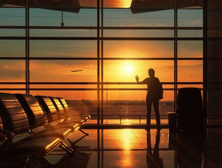 Silhouette of traveling woman waiting for the flight in airport at sunset