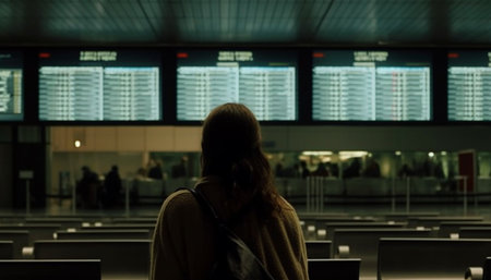 Empty departure hall with rows of seats and a large digital flight board showing destinations
