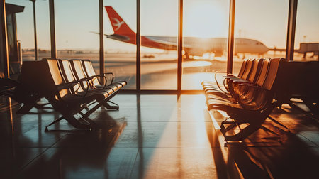A tranquil airport corridor featuring large windows with natural daylight, empty seating, and polished floors. The minimalist design and high-resolution capture create a calming aesthetic.