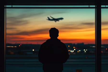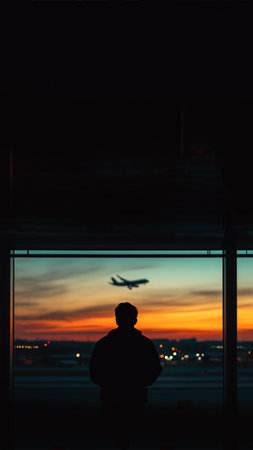 a man standing at the airport, gazing at a plane, symbolizing dreams, hope, and the pursuit of goals. ambition, adventure, and the journey.
