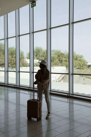 Young beautyful traveler in the departure hall at airport with sunset. Travel and transportation concepts. vintage.