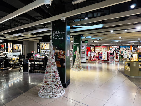 Manchester, UK - December 13, 2025: Festive shopping scene in a modern Manchester store featuring gift ideas, cosmetics and sparkling decor.
