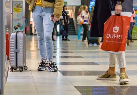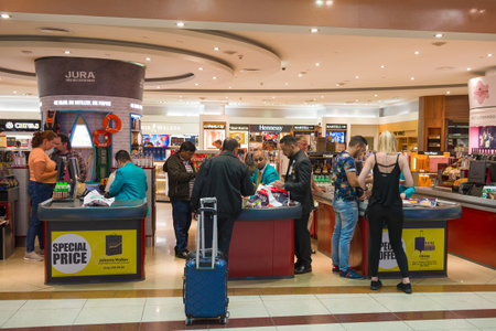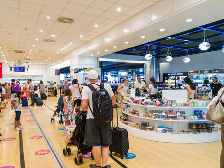 LUTON, UK - JULY 15, 2019: Passengers visit duty free shops at London Luton Airport in the UK. It is UK's 5th busiest airport with 16.5 million annual passengers.