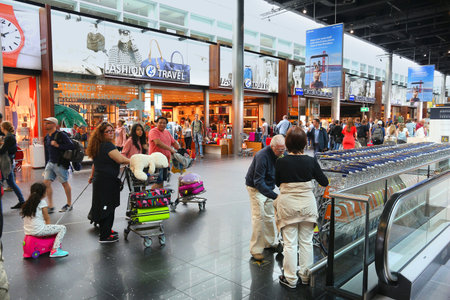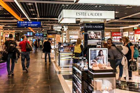 AMSTERDAM, NETHERLANDS - JULY 11, 2017: People visit duty free shops at Schiphol Airport in Amsterdam. Schiphol is the one of busiest airport in the world.