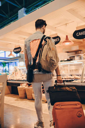 Passenger carries his luggage at the airport terminal