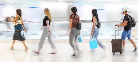 Blur image of People walk rushing in airport shopping tax free area, Blurred background