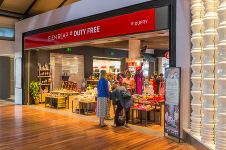 Siem Reap, Cambodia - 16th January 2018: People shopping in Duty Free shops, Siem Reap airport. The airport is 6km from the city.
