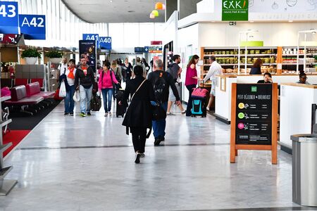 Peoples walking and carries luggage in Vienna airport terminal