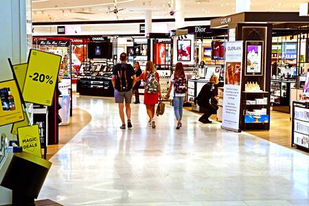 ATHENS, GREECE - May 05: Duty free shop at Athens International Airport Eleftherios Venizelos with passengers walking around in Athens, Greece - May 05, 2015; Duty free shop is favourite past time for passengers on airport before flight.
