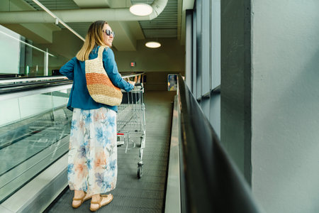 Young woman shopping with a cart driving up an escalator, looking sideways and smiling