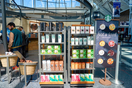 CHICAGO, IL - CIRCA APRIL, 2016: Starbucks Cafe at O'Hare Airport. Starbucks Corporation is an American global coffee company and coffeehouse chain based in Seattle, Washington