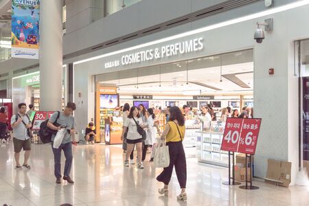 SOUTH KOREA-JULY 16, 2019: Cosmetic and perfume products Shinsegae duty free shops at Incheon International Airport. Trendy beauty bottle on display