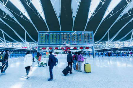 Abstract blurred passengers in an Asian airport background. Motion blur crowed of people walking along the hallway.