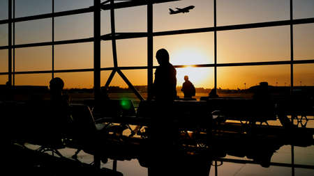 Silhouettes of business people traveling on airport; waiting at the plane boarding gates.