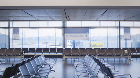 Minimalist shot of an empty airport gate lounge with large windows overlooking airplanes outside