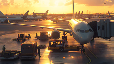 A stunning airport scene at sunset with planes, ground crew, and equipment in a dynamic transportation hub.