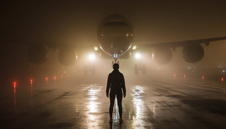 A figure stands confidently in front of a large airplane on a busy terminal runway at night