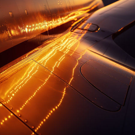 Glorious sunset casts warm hues on the airplane wing, illuminating its surface and showing the beauty of air travel during evening hours.