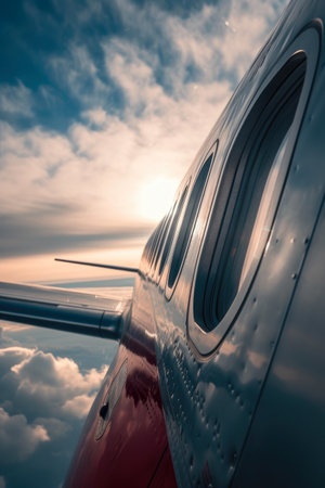 A large airplane is flying through the sky with the sun shining on its wing. Concept of freedom and adventure, as the airplane soars through the open sky