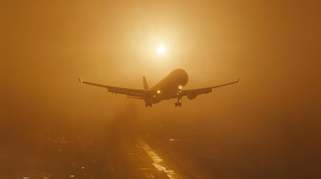 An airplane approaches the runway during a stunning sunset, creating a dramatic silhouette against a misty atmosphere and warm light.