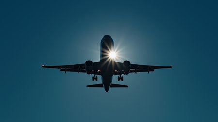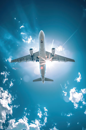 A modern commercial airplane soars through a bright blue sky, symbolizing travel, connectivity, and modern aviation