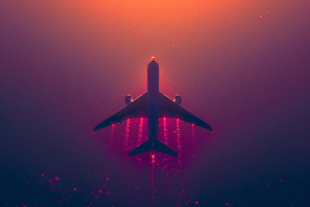 An airplane glides through a stunning sunset sky, leaving behind colorful trails. The scene captures the beauty of air travel against a backdrop of vibrant hues and atmospheric effects..