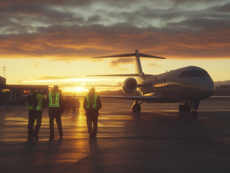 ground crew members in reflective jackets guiding a private jet onto the tarmac at sunset - ai