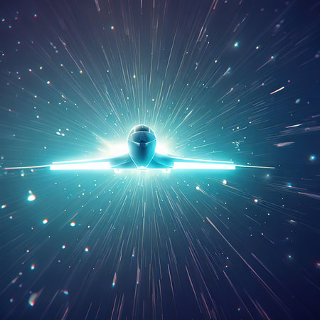 An airplane glides through radiant cosmic energy streams celebrating the New Year with a spectacular display of light and wonder.