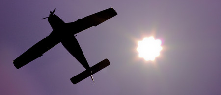 A motor plane is shown flying in the sky, with the sun in the background. The silhouette of the plane is visible against the bright sun.