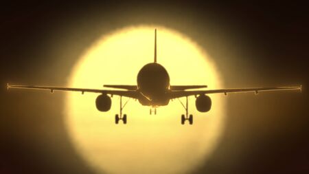 Flying airliner silhouette on yellow sun background. Realistic 3D rendering