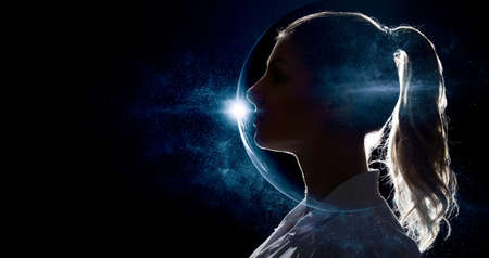 A composite photo of a woman's profile, city and sky