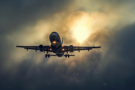 Passenger airplane flying towards setting sun through cloudy sky