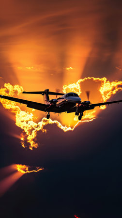 A plane creates glowing contrails as it ascends into the sky, seamlessly blending with the warm hues of the sunset. The atmosphere is vibrant and dynamic, showing nature's beauty.