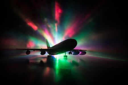 Artwork decoration. White passenger plane ready to taking off from airport runway. Silhouette of Aircraft during night time. Selective focus